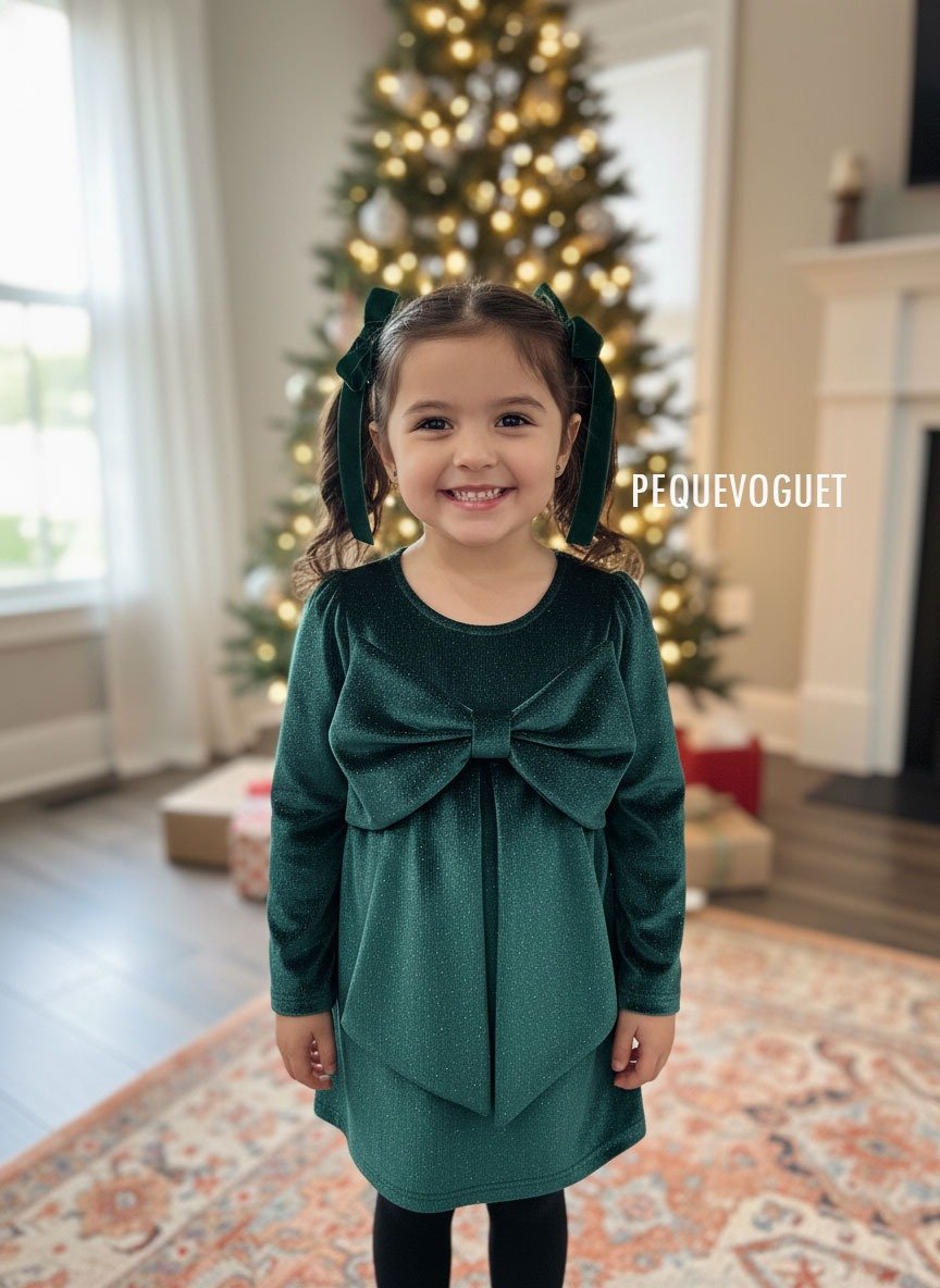 Un vestido verde esmeralda que roba miradas por su brillo suave y su moño protagonista. Cómodo, hermoso y perfecto para fotos familiares, eventos y celebraciones especiales.